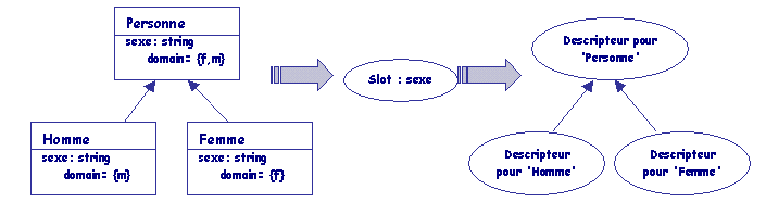 La description d'un slot est défini par l'ensemble des facettes qui sont attachées au slot. Ces facettes décrivent des propriétés du slot, telles que la documentation, le type ou l'inférence. Ainsi, dans l'exemple de la figure Structures, slots et descriptions de slots, à la variable sexe correspond un seul slot, mais une description différente de cette variable est définie pour chacune des classes Personne, Homme et Femme.