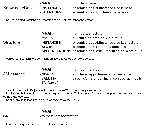 Comme on peut le voir dans la description faite ci-dessus, il existe deux types de propriétés écoutables dans AROM. Les propriétés simples, d'une part, qui correspondent aux attributs directement valués des entités AROM, tels que le nom ou la valeur d'un slot d'une Instance; Ces propriétés sont en italique ci-dessous. Les propriétés composites, d'autre part, qui représentent des ensembles d'entités ou de propriétés, pouvant être elles-mêmes composites; Ces propriétés sont représentées en gras dans les schémas qui suivent. C'est par exemple l'ensemble des AMInstance d'une structure ou l'ensemble des Intention d'une base de connaissances. Les schémas qui suivent détaillent les propriétés écoutables pour les différentes entités AROM.