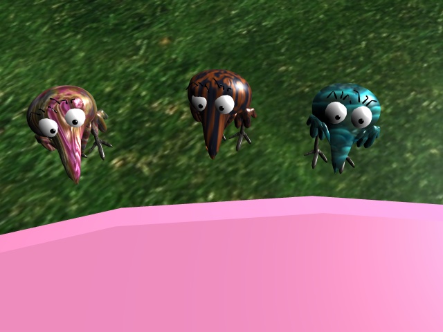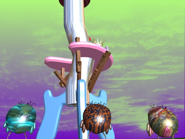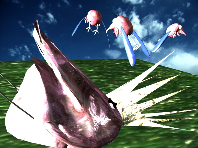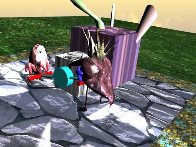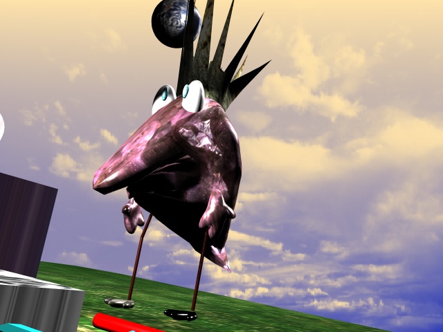 Le roi se retrouve donc quelques mètres plus loin, complètement sonné. Des Shadoks tournent autour de sa tête, dessinant des cercles ( courbes de Bézier ) ( les Shadoks ne connaissent pas les oiseaux ). La caméra, elle aussi, tournoie rapidement autour du roi pour montrer que tout semble tourner autour du pauvre Shadok assommé ( courbes de Bézier + Key Frame pour orientation + tracking pour garder le Shadok au centre de l'image ).