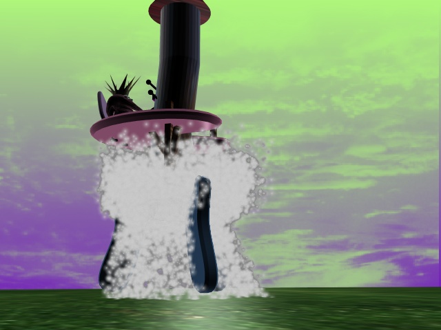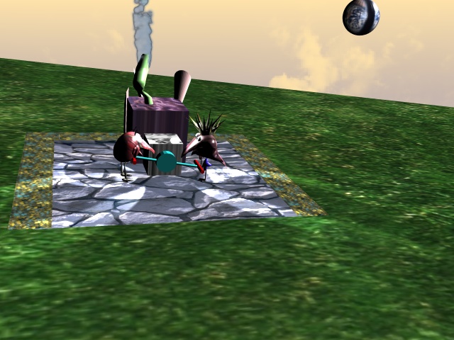 Les Shadoks sont des êtres primitifs dont l'instinct les pousse à croire que seule l'action de pomper ne prévaut. La séquence commence donc sur un plan général. Au loin, on découvre une bien curieuse machine d'où s'échappe de la fumée ( nuage de particules ) ( figure 3 ). En son centre se trouve un actionneur, aux extrémités duquel se tiennent le roi et un Shadok. Les deux Shadoks pompent à tour de rôle pour produire plus de fumée.