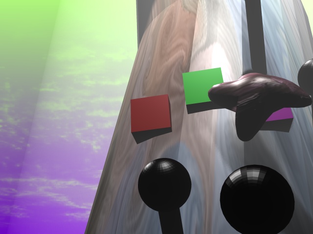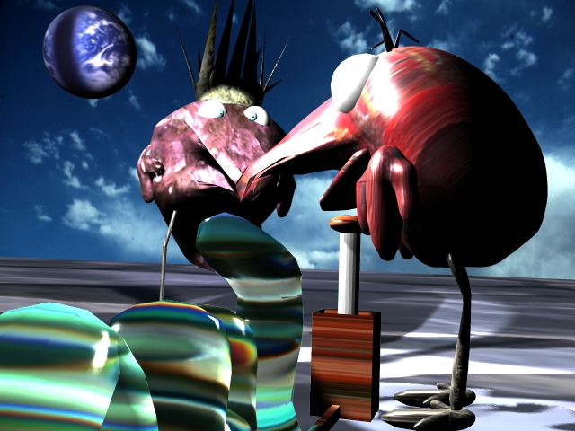 N'ayant aucune base en modélisation et seulement des notions en animations, il nous a fallu beaucoup de temps pour nous familiariser avec l'environnement de Blender, ce qui explique que nous n'ayons pu respecter, à la lettre, le story board que nous avions mis au point. Devant les problèmes rencontrés, nous avons fait le choix de privilégier l'apparence ( usage de nombreuses textures, jeux de lumières, ombrages, effets visuels, ... ) et le côté humoristique ( déformations volontaires, animations peu réalistes, ... ) au détriment, parfois, de l'animation. Nous avons, néanmoins, utilisé le maximum de techniques d'animation vues en TD, à savoir le Key Frame, le Path/Track, les latices, les vertex, les Ika et les particules. Nous avons également mis l'accent sur l'aspect esthétique, renforcé par l'utilisation de différentes prises de vues ( gros plans, contre-plongées, plans panoramiques, plans séquences, plans en contre-jour ( voir 3. et 4. ), scrolling, fondus enchaînés, ... ) et l'apparence comique de nos personnages et objets ( modélisation particulière, textures étranges, ... ). Enfin, nous nous sommes fortement inspirés du scénario 3 qui été proposé, pour mettre en scène nos personnages et leur donner vie, et espérons être parvenus à allier esthétisme et humour.