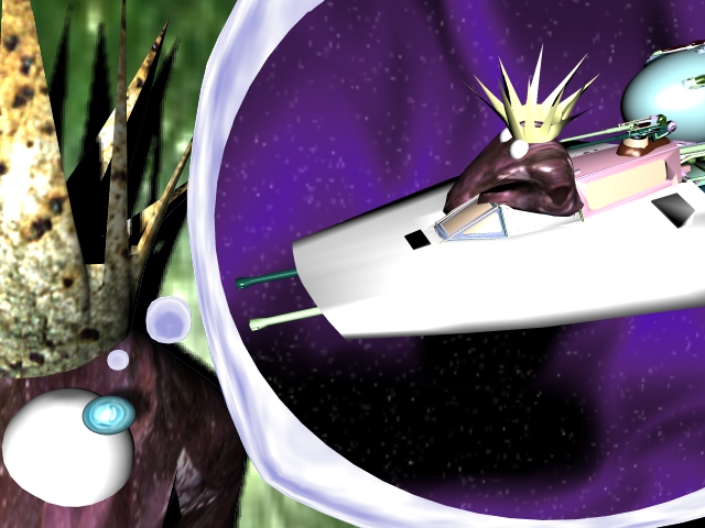 La première image est un gros plan sur l'oeil droit du roi, la Terre en image de fond. Le roi regarde le Shadok ( déplacement des yeux à l'aide des Vertex ). Puis, la caméra se recule peu à peu, suivant les courbes d'un chemin défini par un Curve Path ( courbe de Bézier ), dévoilant le deuxième personnage de la scène, la pompe, et une chose informe couchée sur le sol et reliée à la pompe. Les mouvements de la caméra en rotation utilisent le Key Frame. La « chose informe » se dilate peu à peu sous l'action des mouvements répétés du Shadok ( utilisation du Key Frame pour agrandir le « ballon »).